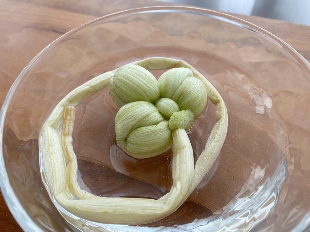 ずいきを使用する際には、ぬるま湯もしくは水に数分間つけてから使用します。