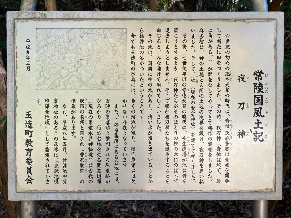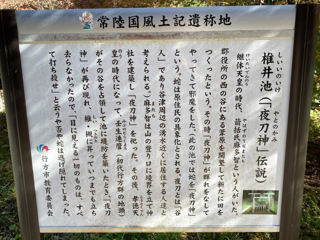 その後、孝徳天皇の時代(645年~654年)に壬生連麿(みぶのむらじまろ)という人が、谷の池に堤を築こうとすると、夜刀神が池の周囲にある椎の木に上り集まって、いつまでもいなくならない。