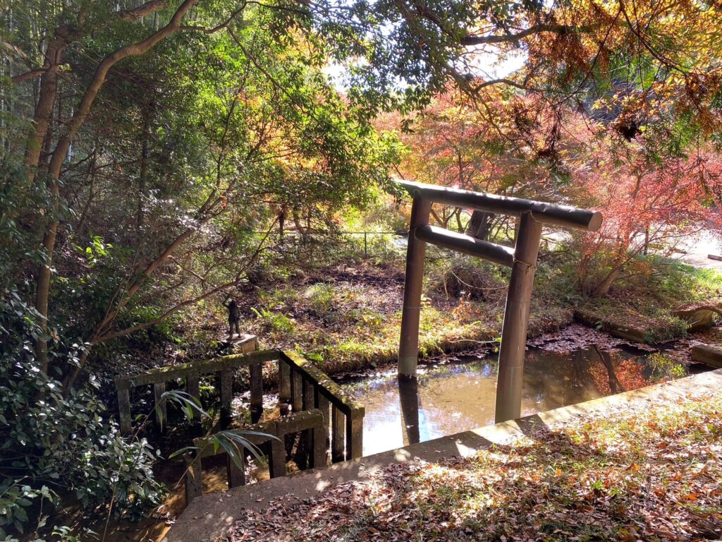 駐車場のすぐ側には、夜刀神説話にでてきた「椎井池」と伝わる鳥居のある池があり、その横にはお社へ続く道があります。
