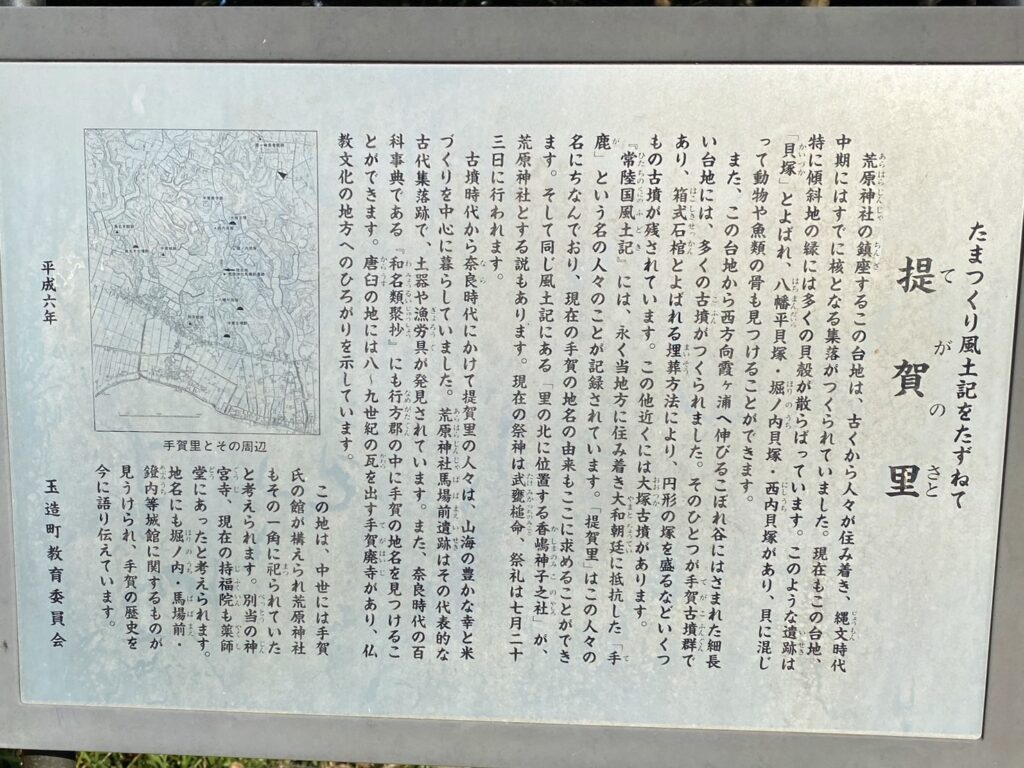 案内板を読むと、この辺りには貝塚や古墳が多数あり、縄文時代から集落があったとのこと。昔からここに住んでいた手鹿という名の人たちはヤマト朝廷に抵抗したようです。