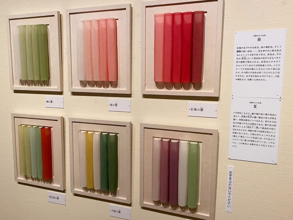 源氏物語にでてくる衣装の襲(かさね)を再現したもの↓