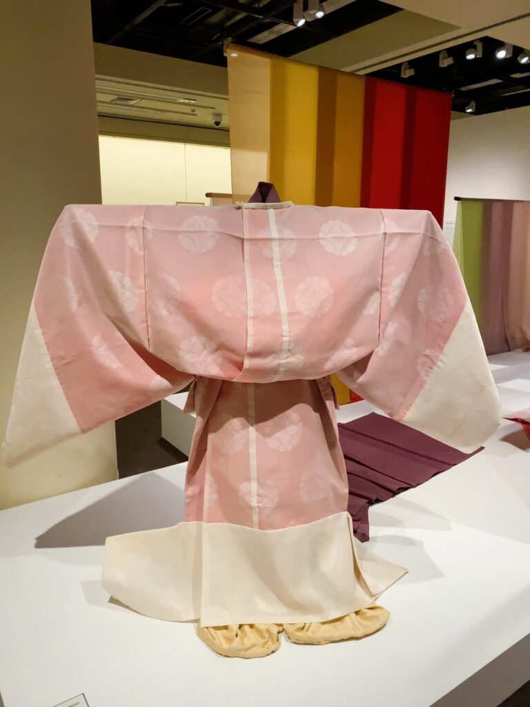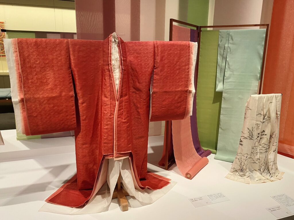 写真左側は、源氏物語の明石女御の紅梅の御衣を再現したもの↓
