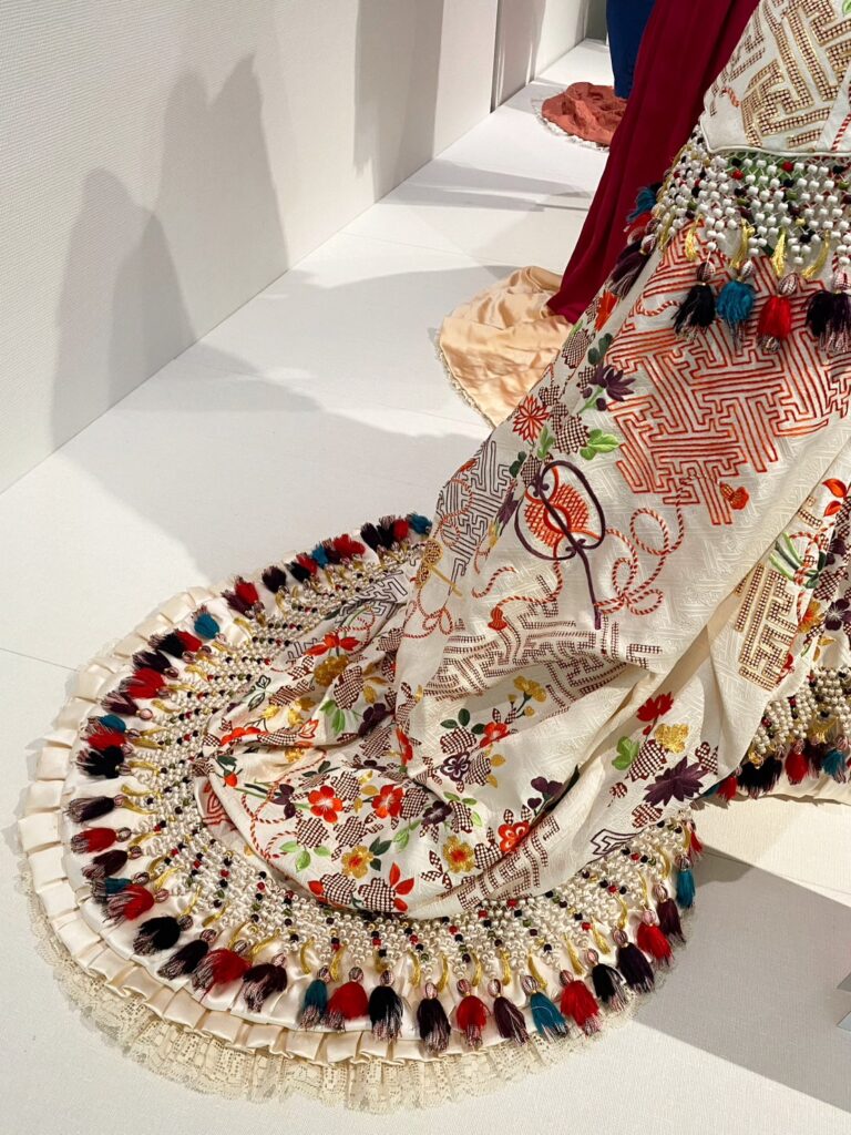 日本の小袖をドレスに仕立てたもので、復元には同じ模様に染めた生地に刺繍を施したものを特注して製作。細部まで忠実に再現されています。