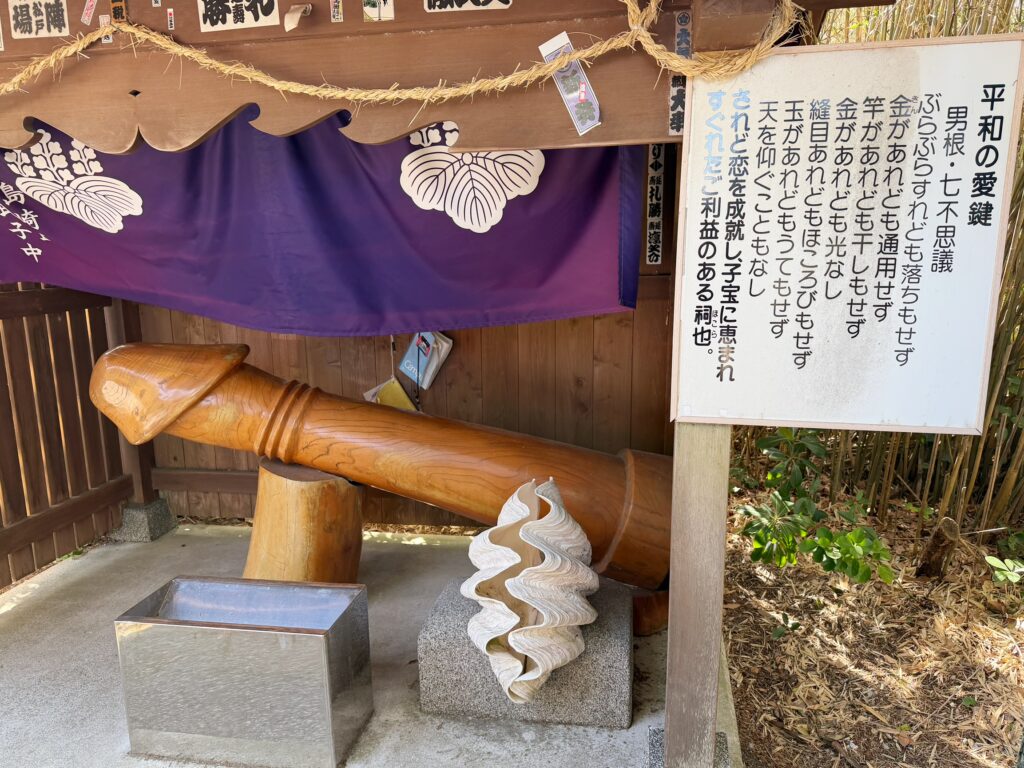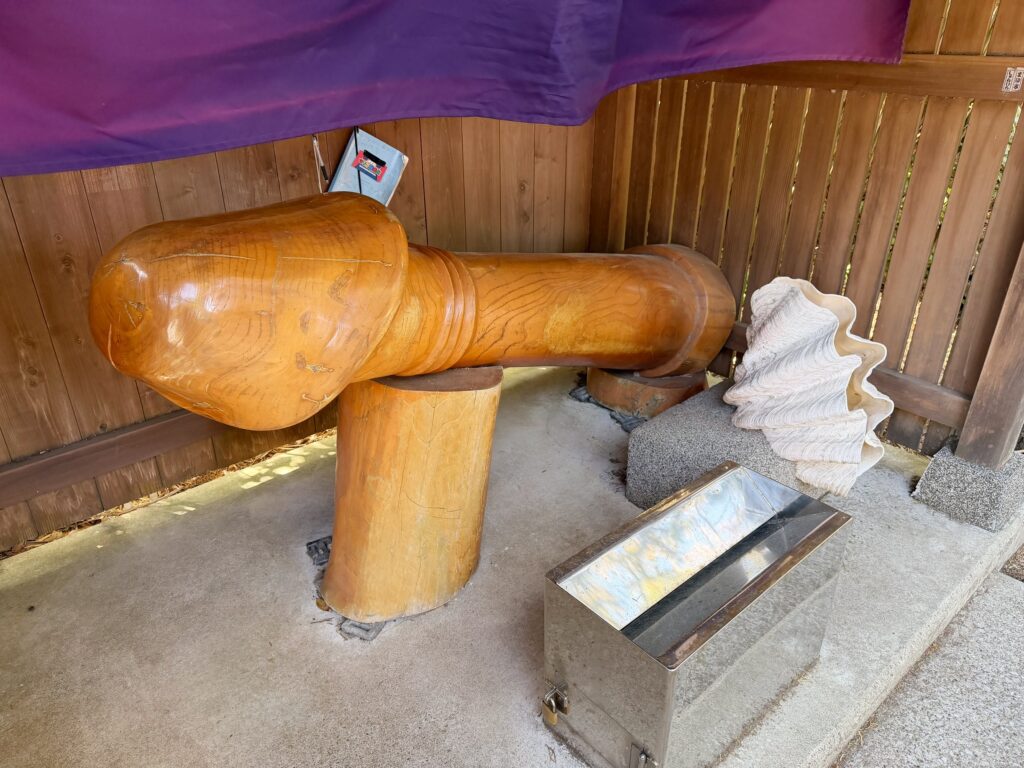 巨大な男性器を模した木像と、おそらく女性器を象徴する大きな貝殻。